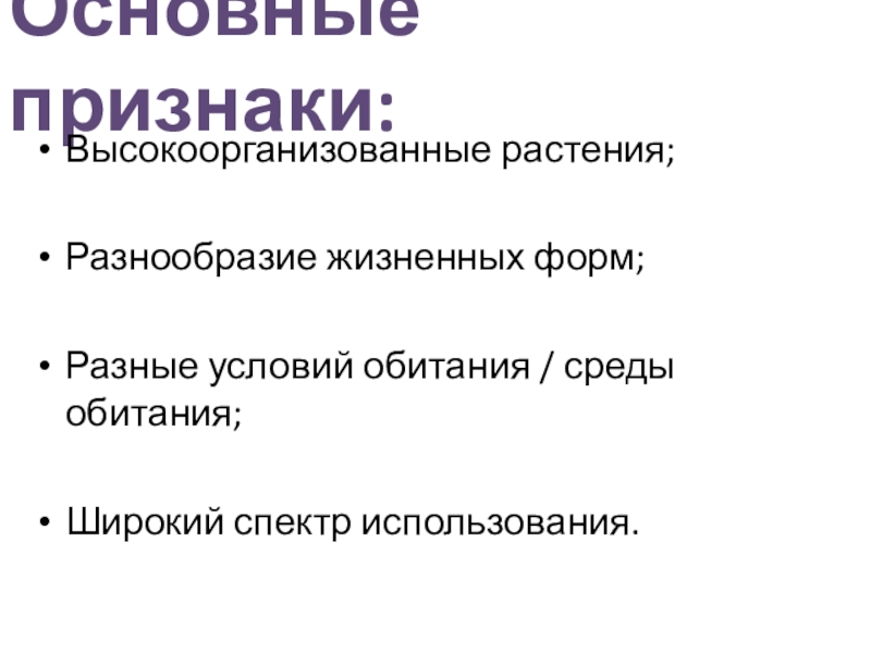 Основные признаки:Высокоорганизованные растения;Разнообразие жизненных форм;Разные условий обитания / среды обитания;Широкий спектр использования.