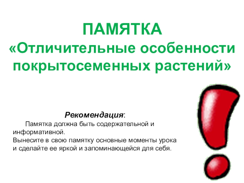 ПАМЯТКА «Отличительные особенности покрытосеменных растений»Рекомендация:	Памятка должна быть содержательной и информативной.Вынесите в свою памятку основные моменты урока и