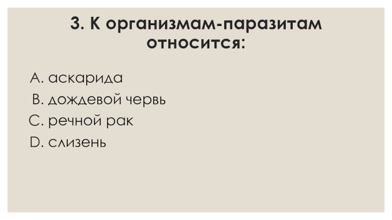 3. К организмам-паразитам относится: аскарида дождевой червь  речной рак слизень