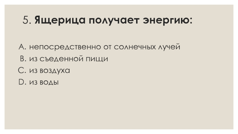 5. Ящерица получает энергию: непосредственно от солнечных лучей    из съеденной пищииз воздуха