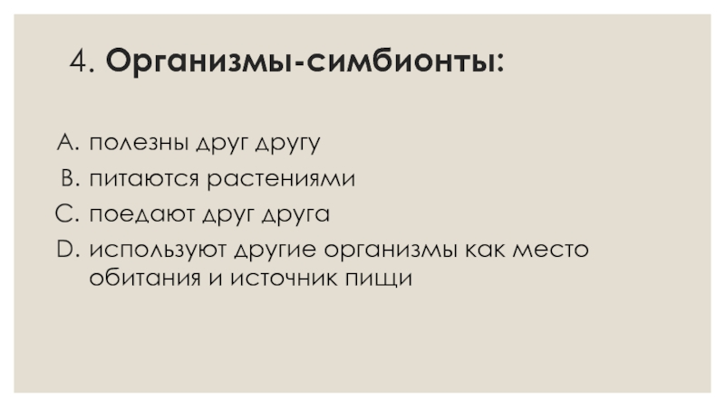 4. Организмы-симбионты: полезны друг другу   питаются растениямипоедают друг друга   используют другие организмы как