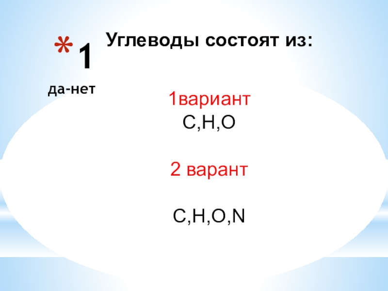 1 да-нетУглеводы состоят из:1вариантС,H,O2 варантC,H,O,N