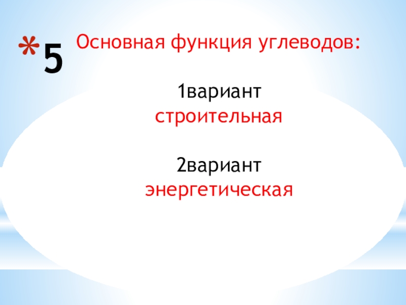 5Основная функция углеводов:1вариантстроительная2вариантэнергетическая