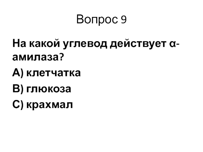 Вопрос 9На какой углевод действует α-амилаза?А) клетчаткаВ) глюкозаС) крахмал