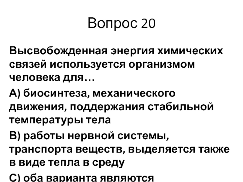 Вопрос 20Высвобожденная энергия химических связей используется организмом человека для…А) биосинтеза, механического движения, поддержания стабильной температуры телаВ) работы