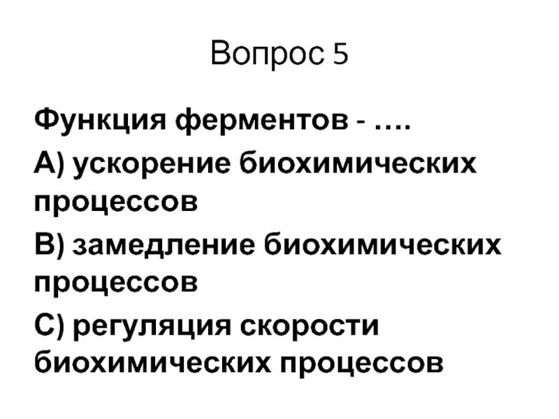 Вопрос 5Функция ферментов - ….А) ускорение биохимических процессовВ) замедление биохимических процессовС) регуляция скорости биохимических процессов