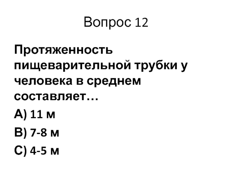 Вопрос 12Протяженность пищеварительной трубки у человека в среднем составляет…А) 11 мВ) 7-8 мС) 4-5 м