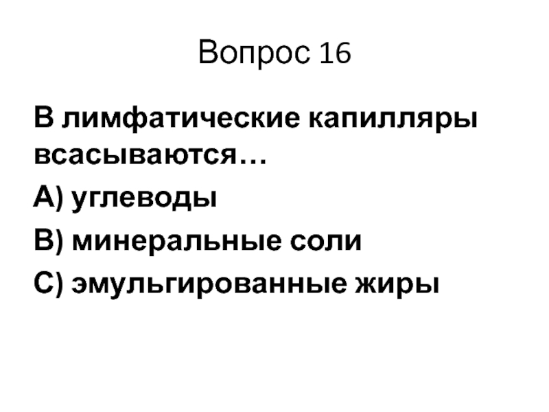 Вопрос 16В лимфатические капилляры всасываются…А) углеводыВ) минеральные солиС) эмульгированные жиры