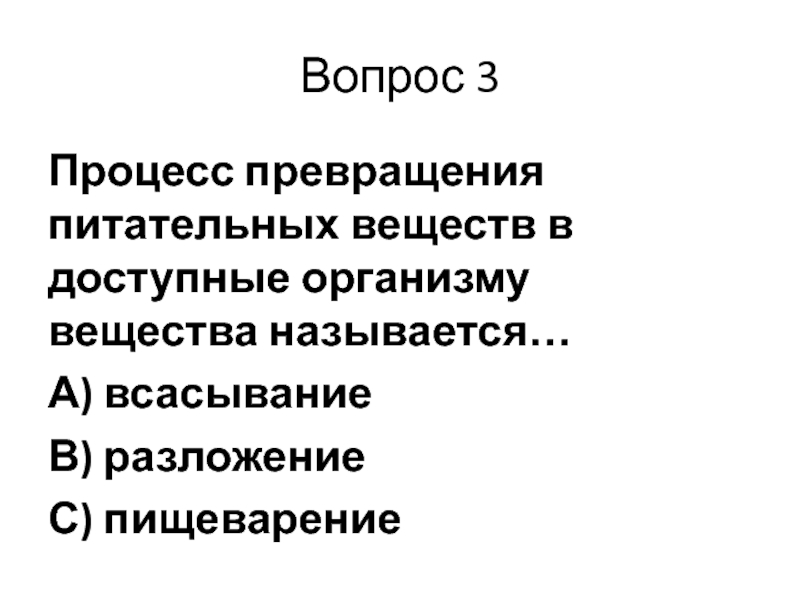 Вопрос 3Процесс превращения питательных веществ в доступные организму вещества называется…А) всасываниеВ) разложениеС) пищеварение