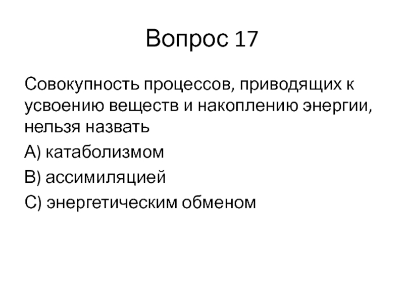 Вопрос 17Совокупность процессов, приводящих к усвоению веществ и накоплению энергии, нельзя назватьА) катаболизмомВ) ассимиляциейС) энергетическим обменом