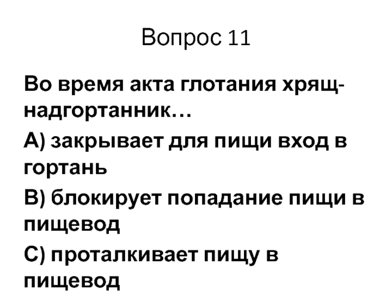 Вопрос 11Во время акта глотания хрящ-надгортанник…А) закрывает для пищи вход в гортаньВ) блокирует попадание пищи в пищеводС)