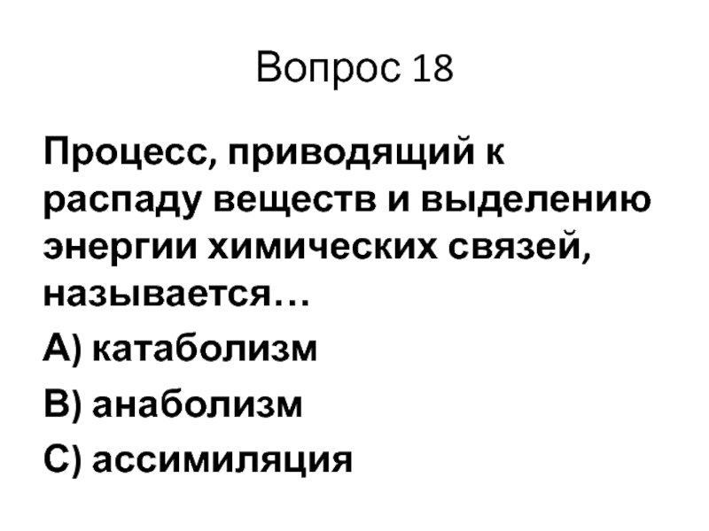 Вопрос 18Процесс, приводящий к распаду веществ и выделению энергии химических связей, называется…А) катаболизмВ) анаболизмС) ассимиляция