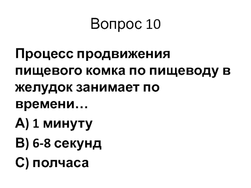 Вопрос 10Процесс продвижения пищевого комка по пищеводу в желудок занимает по времени…А) 1 минутуВ) 6-8 секундС) полчаса