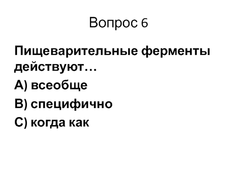 Вопрос 6Пищеварительные ферменты действуют…А) всеобщеВ) специфичноС) когда как