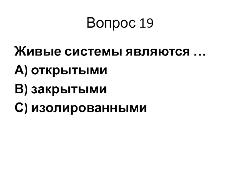 Вопрос 19Живые системы являются …А) открытымиВ) закрытымиС) изолированными