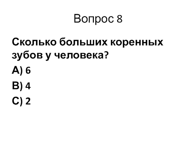 Вопрос 8Сколько больших коренных зубов у человека?А) 6В) 4С) 2