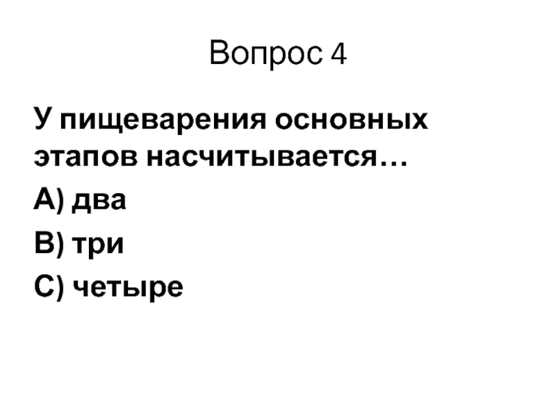 Вопрос 4У пищеварения основных этапов насчитывается…А) дваВ) триС) четыре