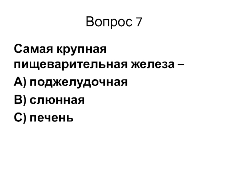 Вопрос 7Самая крупная пищеварительная железа – А) поджелудочнаяВ) слюннаяС) печень