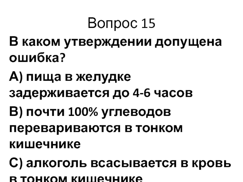 Вопрос 15В каком утверждении допущена ошибка?А) пища в желудке задерживается до 4-6 часовВ) почти 100% углеводов перевариваются