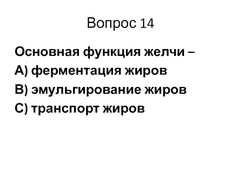 Вопрос 14Основная функция желчи –А) ферментация жировВ) эмульгирование жировС) транспорт жиров
