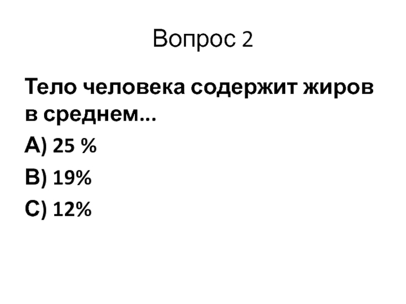 Вопрос 2Тело человека содержит жиров в среднем...А) 25 %В) 19%С) 12%