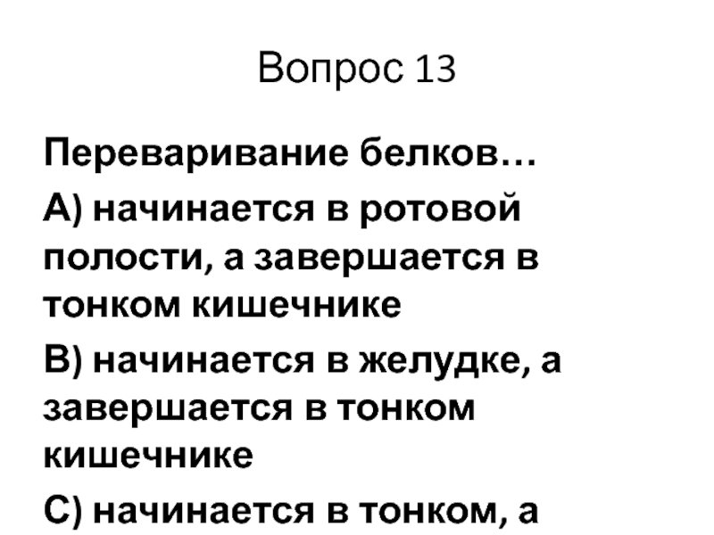 Вопрос 13Переваривание белков…А) начинается в ротовой полости, а завершается в тонком кишечникеВ) начинается в желудке, а завершается