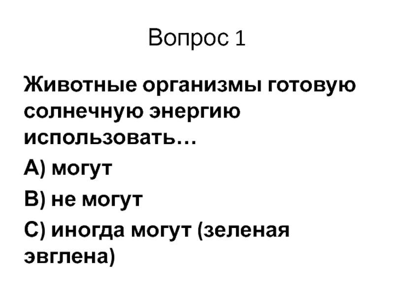 Вопрос 1Животные организмы готовую солнечную энергию использовать…А) могутВ) не могутС) иногда могут (зеленая эвглена)