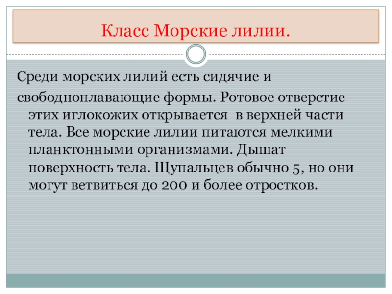 этих иглокожих открывается в верхней части тела. Все морские лилии питаются мелкими планктонными организмами. Дышат поверхность тела. Щупальцев обычно 5, но они могут ветвиться до 200 и более отростков.