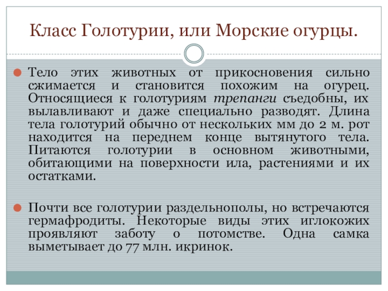 и становится похожим на огурец. Относящиеся к голотуриям трепанги съедобны, их вылавливают и даже специально разводят. Длина тела голотурий обычно от нескольких мм до 2 м. рот находится на переднем конце вытянутого тела. Питаются голотурии в основном животными, обитающими на поверхности ила, растениями и их остатками.