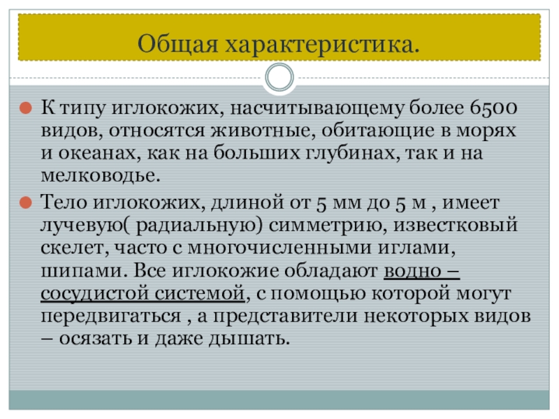 Тело иглокожих, длиной от 5 мм до 5 м , имеет лучевую( радиальную) симметрию, известковый скелет, часто с многочисленными иглами, шипами. Все иглокожие обладают водно – сосудистой системой, с помощью которой могут передвигаться , а представители некоторых видов – осязать и даже дышать.
