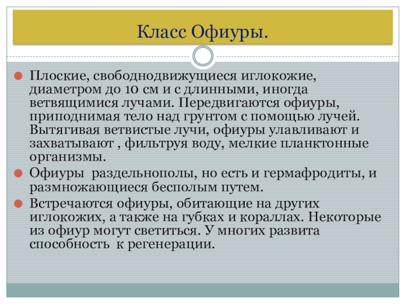 иногда ветвящимися лучами. Передвигаются офиуры, приподнимая тело над грунтом с помощью лучей. Вытягивая ветвистые лучи, офиуры улавливают и захватывают , фильтруя воду, мелкие планктонные организмы.