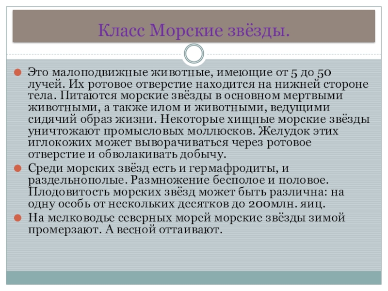 Это малоподвижные животные, имеющие от 5 до 50 лучей.