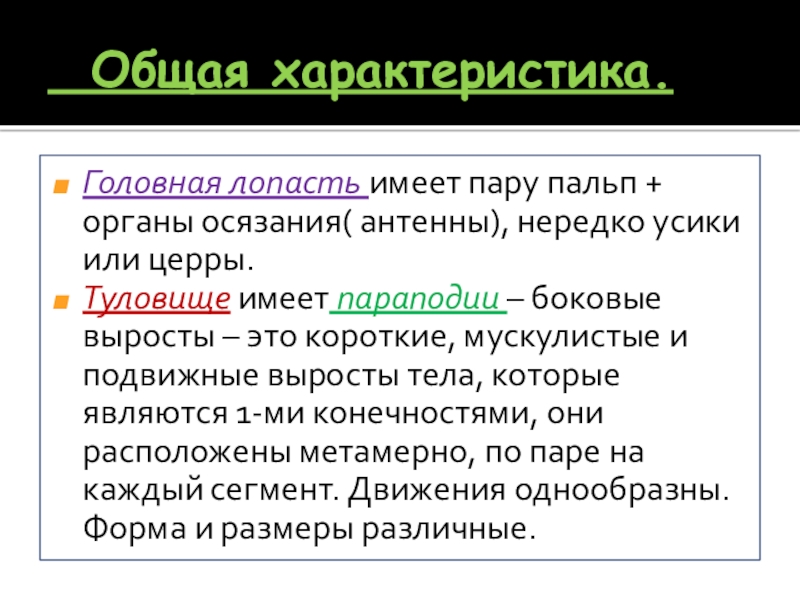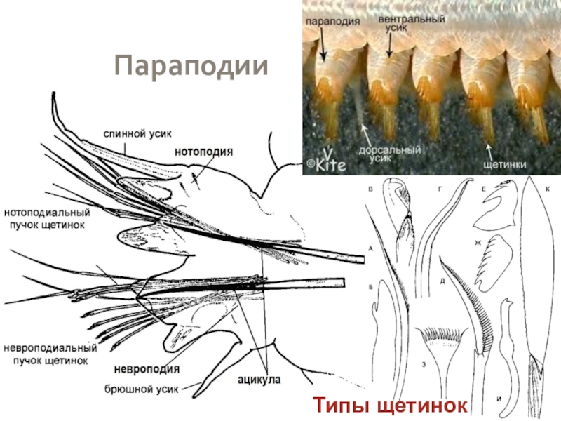Туловище имеет параподии – боковые выросты – это короткие, мускулистые и подвижные выросты тела, которые являются 1-ми конечностями, они расположены метамерно, по паре на каждый сегмент. Движения однообразны. Форма и размеры различные.
