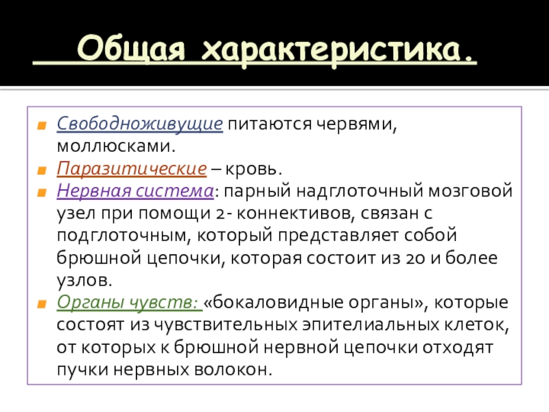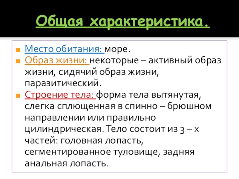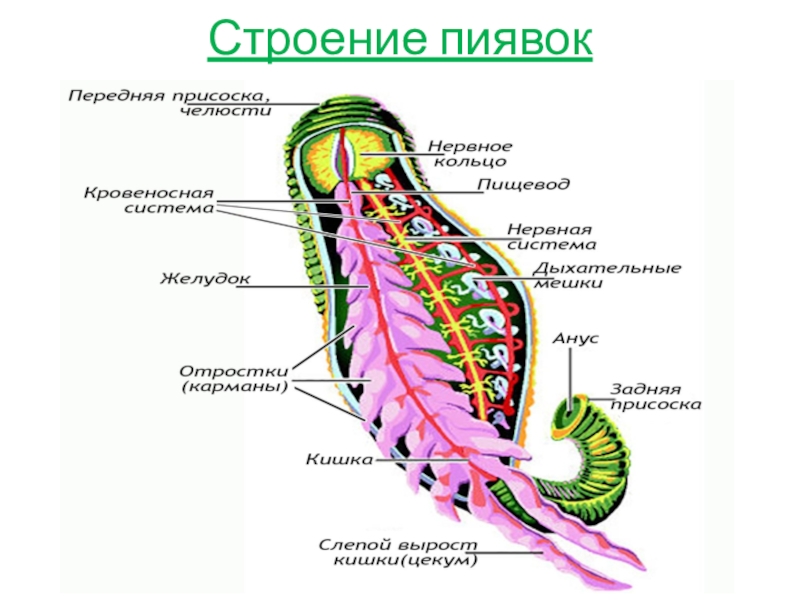 Строение тела: форма тела вытянутая, слегка сплющенная в спинно – брюшном направлении или правильно цилиндрическая. Тело состоит из 3 – х частей: головная лопасть, сегментированное туловище, задняя анальная лопасть.