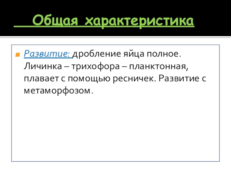 Развитие: дробление яйца полное. Личинка – трихофора –