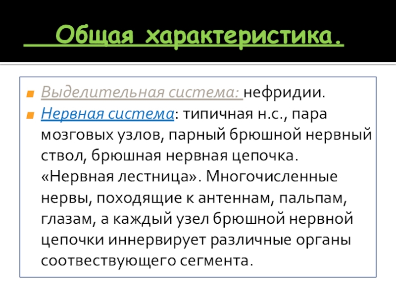 узлов, парный брюшной нервный ствол, брюшная нервная цепочка. «Нервная лестница». Многочисленные нервы, походящие к антеннам, пальпам, глазам, а каждый узел брюшной нервной цепочки иннервирует различные органы соотвествующего сегмента.