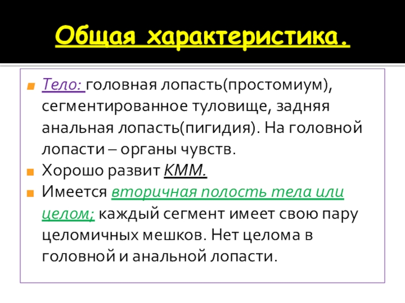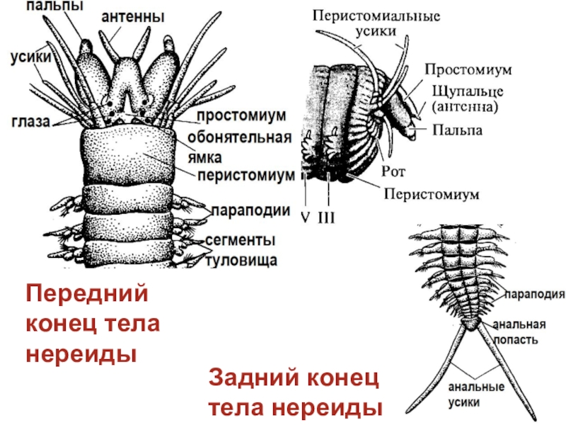 Тело: головная лопасть(простомиум), сегментированное туловище, задняя анальная