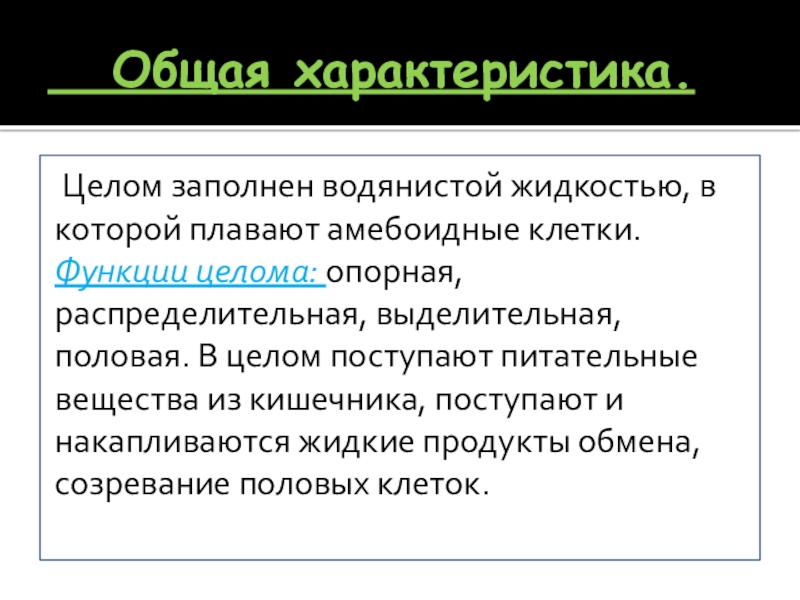 Функции целома: опорная, распределительная, выделительная, половая. В целом поступают питательные вещества из кишечника, поступают и накапливаются жидкие продукты обмена, созревание половых клеток.