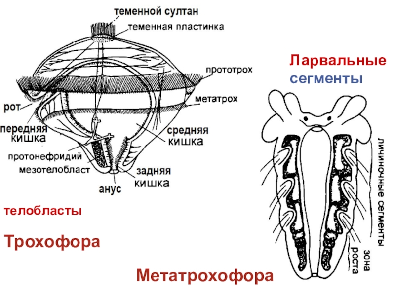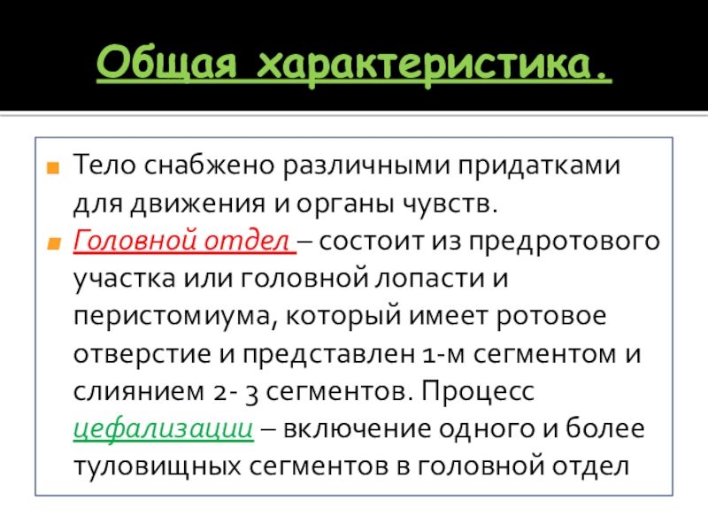 Головной отдел – состоит из предротового участка или головной лопасти и перистомиума, который имеет ротовое отверстие и представлен 1-м сегментом и слиянием 2- 3 сегментов. Процесс цефализации – включение одного и более туловищных сегментов в головной отдел