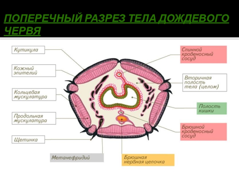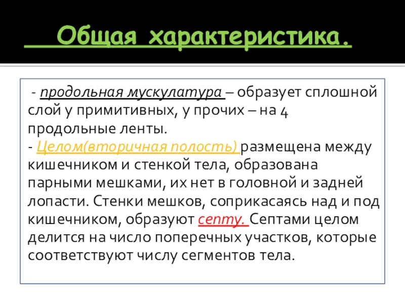 - Целом(вторичная полость) размещена между кишечником и стенкой тела, образована парными мешками, их нет в головной и задней лопасти. Стенки мешков, соприкасаясь над и под кишечником, образуют септу. Септами целом делится на число поперечных участков, которые соответствуют числу сегментов тела.