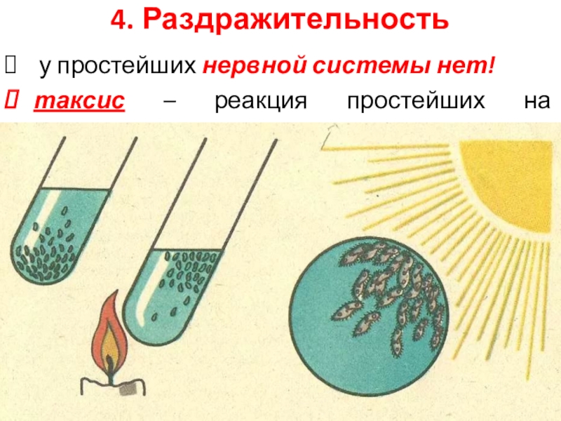 4. Раздражительность  у простейших нервной системы нет!таксис – реакция простейших на раздражитель.