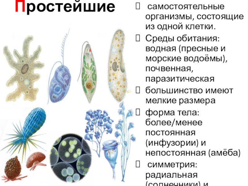 Тип Простейшие самостоятельные организмы, состоящие из одной клетки.Среды обитания: водная (пресные и морские водоёмы), почвенная, паразитическаябольшинство имеют