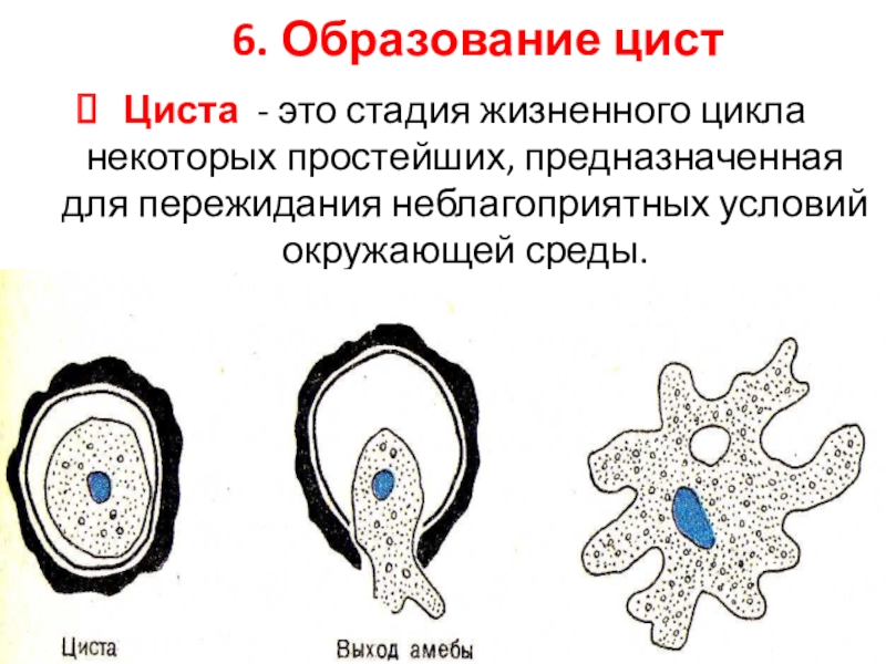 6. Образование цистЦиста - это стадия жизненного цикла некоторых простейших, предназначенная для пережидания неблагоприятных условий окружающей среды.