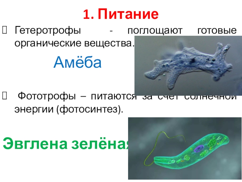 1. Питание Гетеротрофы - поглощают готовые органические вещества.        Амёба Фототрофы