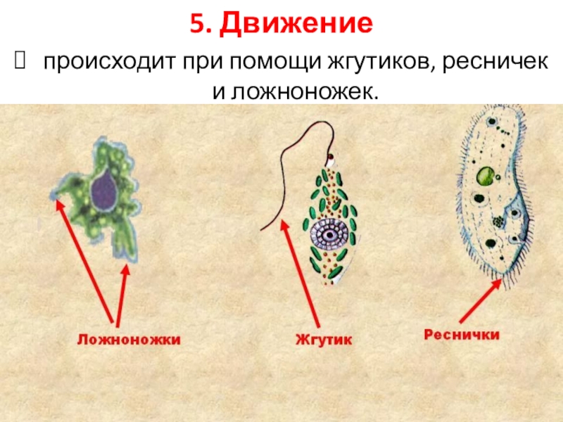 5. Движениепроисходит при помощи жгутиков, ресничек и ложноножек.