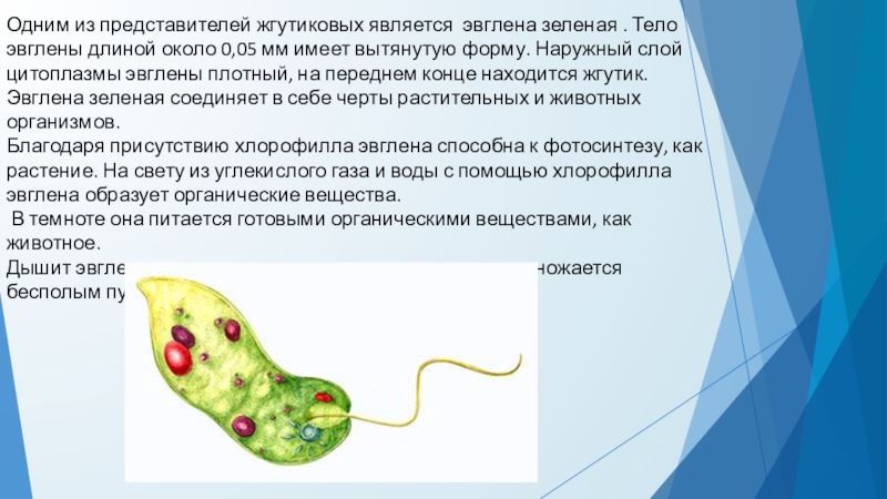 Слайд 9Одним из представителей жгутиковых является эвглена зеленая . Тело эвглены длиной