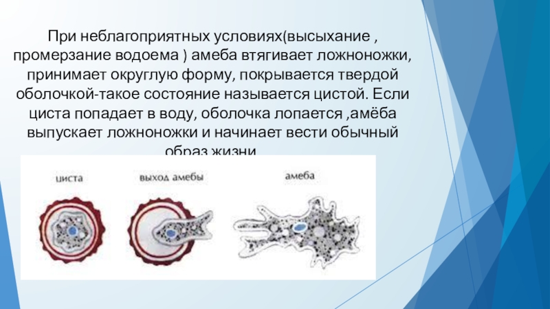 Слайд 7При неблагоприятных условиях(высыхание ,промерзание водоема ) амеба втягивает ложноножки, принимает округлую