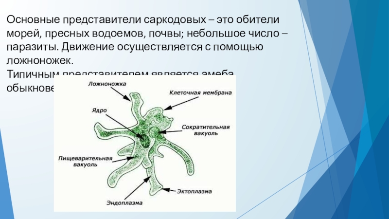 Слайд 5Основные представители саркодовых – это обители морей, пресных водоемов, почвы; небольшое