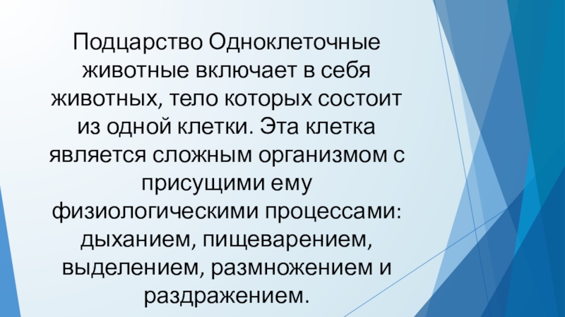 Подцарство Одноклеточные животные включает в себя животных, тело которых состоит из одной клетки. Эта клетка является сложным организмом с присущими ему физиологическими процессами: дыханием, пищеварением, выделением, размножением и раздражением.