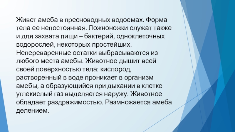 Живет амеба в пресноводных водоемах. Форма тела ее непостоянная. Ложноножки служат также и для захвата пищи –